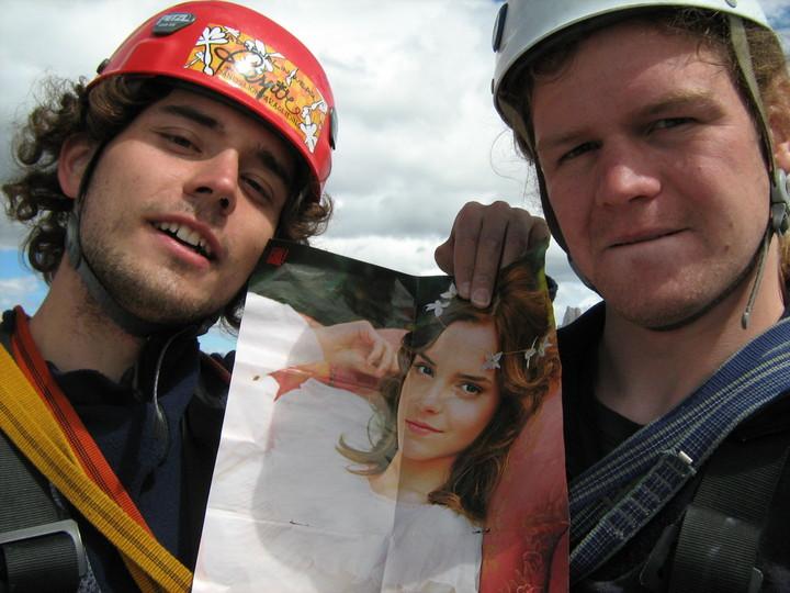 Následující pasáž je na Bártovi. Nevíme, za kolik to to je, protože z topa není jasné, co je to za délku. Možná to měla být závěrečná trojka, což teda můžu s klidným svědomím říct, že nebyla. Byl tam jeden nepříjemnej výšvih, navíc dost vysoko nad jištěním, v celé délce byla jenom jedna skoba a zajistit to asi moc nešlo. O nějakou dobu později stojíme na vrcholu a připadáme si jako borci. Já s jedním odsedem, Bárt trochu poškádlil stupeň A0, ale pořád jsme podali slušnej výkon. Na vrcholu se super výhledem jsme sami - i když vlastně ne tak úplně. Teprve teď přichází ten pravý triumf a z kapsy vytahuju plakát Emmy Watson, který jsme s blahem v duši (společně s párem magnetických náušnic) našli v časopise Bravo Girl! zakoupeném ve středu večer na Rozvadově. Tehdy jsme si taky řekli, že Emmě ukážeme, jak vypadaj pořádný kopce. Blejskeme pár vrcholových fotek s představitelkou sličné Hermiony z Harryho Pottera a mažeme k sestupu. Tak jsme to těm klasikům přece jenom natřeli!